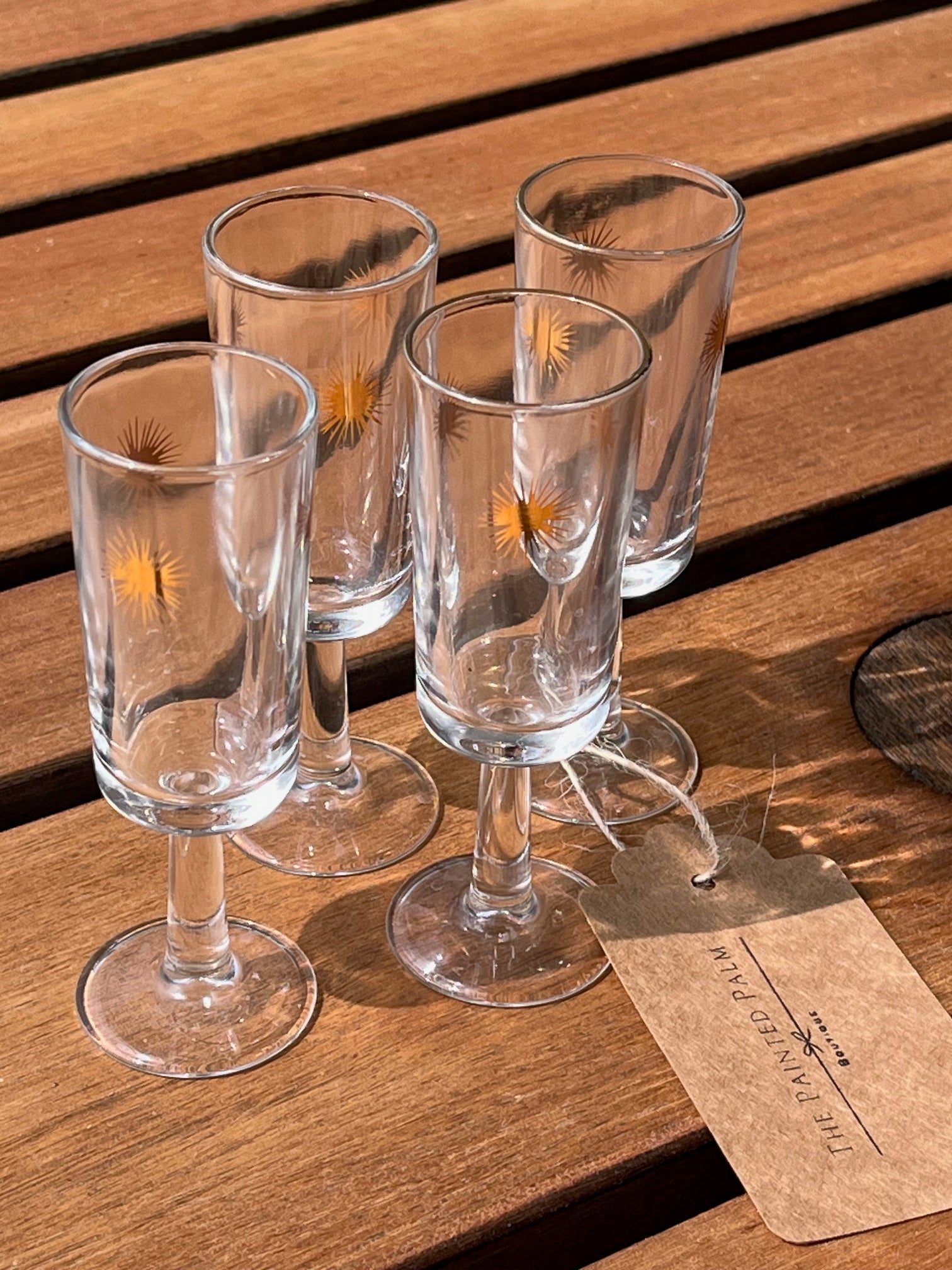 Mid Century Modern-1960's Vintage Atomic Starburst Cordial glasses. Set of 4. Dimensions 4.5" in height. Approximately 1oz