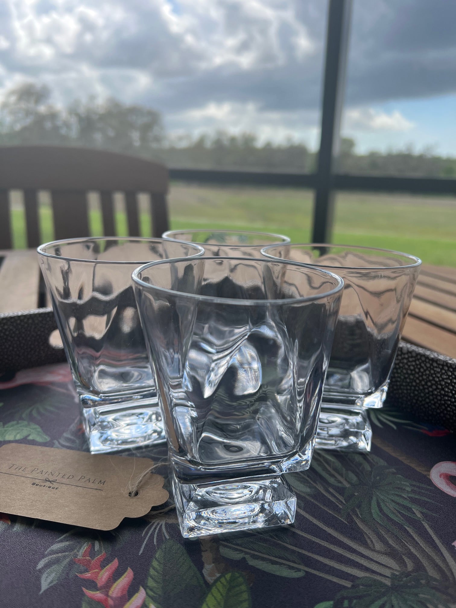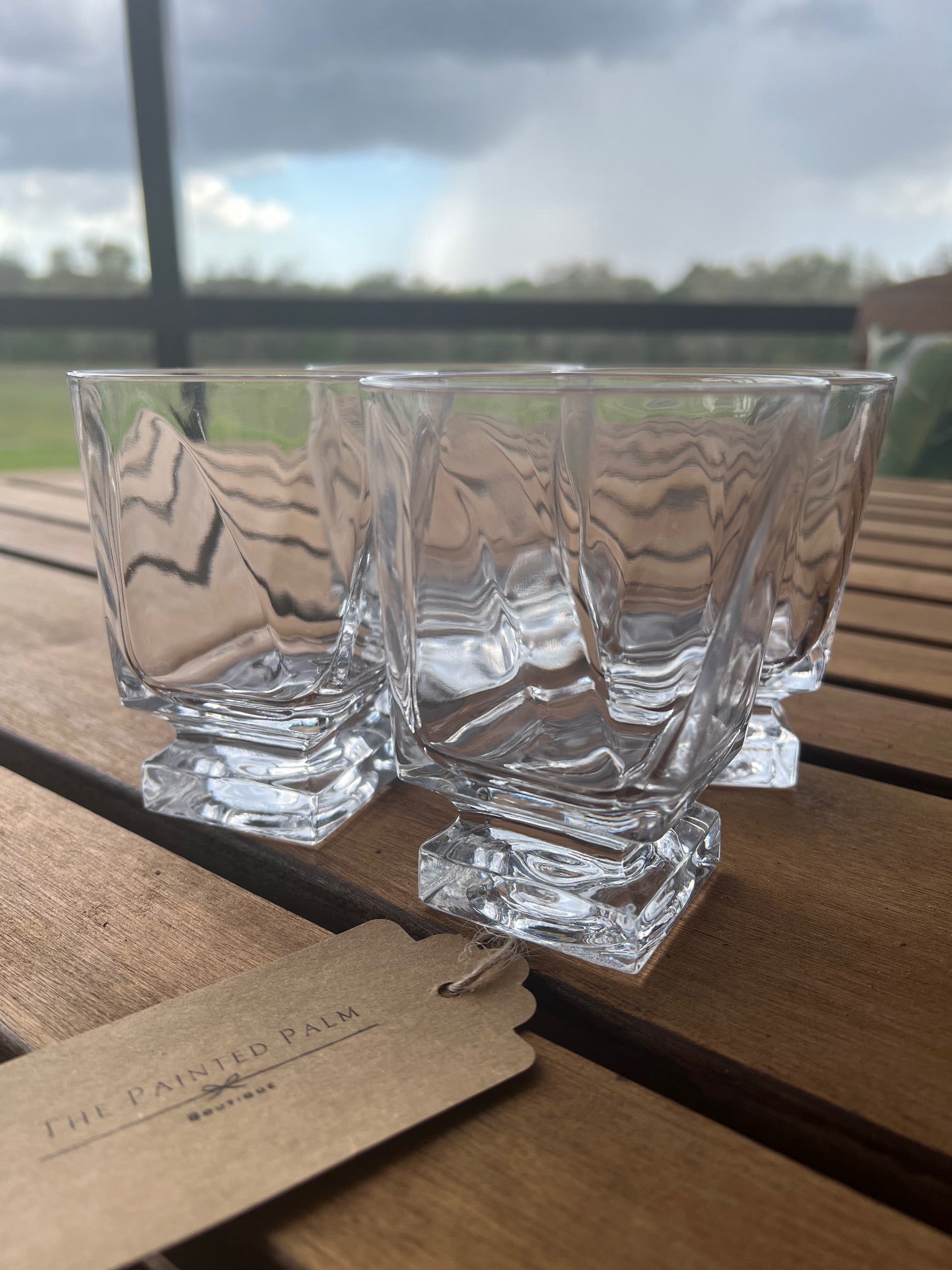 MCM Fostoria Clear Square-Based Double Old Fashion Tumbler. Characterized by clean geometric lines and perfect for serving whiskey and cocktails. These glasses offer a refined yet minimalist aesthetic that compliments both vintage and contemporary settings. Set of four, approximately 4.25" in height. Holds 4oz.